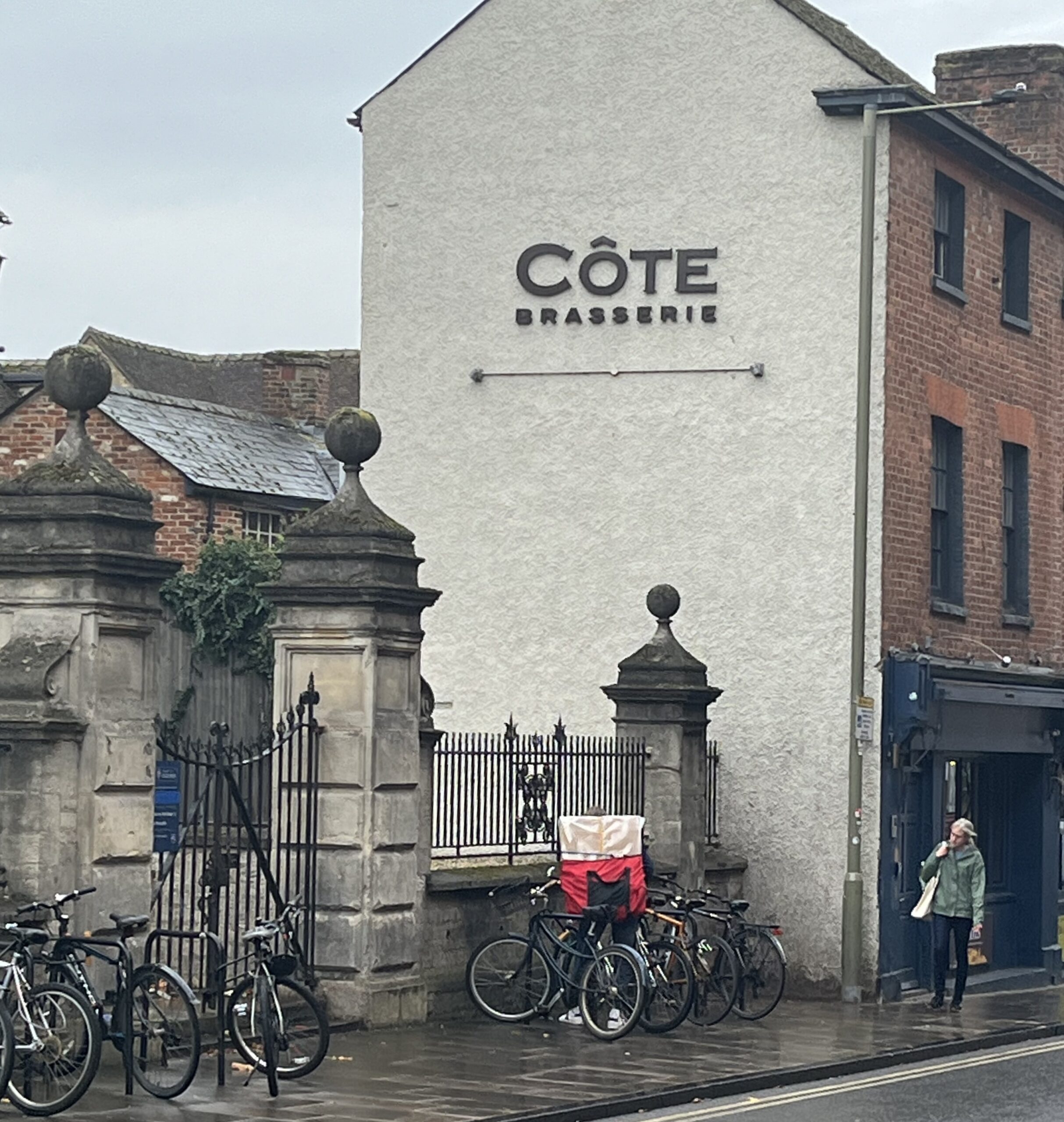 On a mild day in October, we attended the annual lunch. This by tradition is at the Cote Brasserie in George Street Oxford. We always must book because the date we usually pick is the Oxford Matriculation Day and so the city is packed with proud parents and students all wanting to eat (anywhere decent!). So, the town was packed. The advantage of the lunch time meal is the deals you can get. This is traditional French food and they take their time to prepare it. The sauces are rich in cream, oil, and herbs. Every year I have the French Onion Soup. It is expensive (£8) but what you get is absolutely superb. A bowl jam packed with onion, a beautifully flavoured consommé and an amazing large crouton liberally covered in cheese. It is a meal in itself. The sweets are orientated to France and the waiters are I believe French. The cook certainly is.